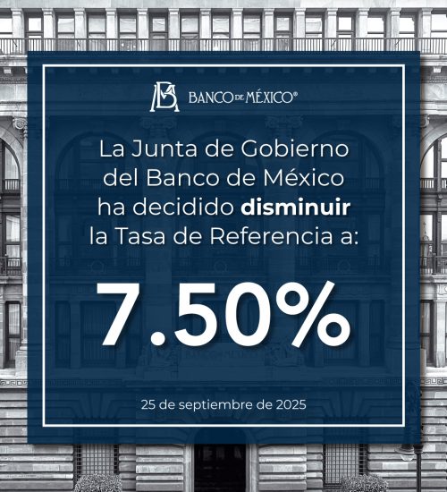 La Junta de Gobierno del Banco de México (Banxico) resolvió disminuir en 25 puntos base el objetivo para la Tasa de Interés Interbancaria a un día, estableciéndola en 7.50% con efectos a partir del 26 de septiembre de 2025. Esta […]